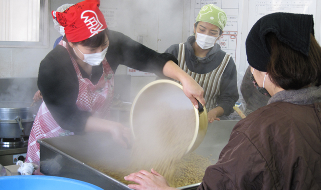 昔は各農家さんが、冬場の農閑期に自家栽培・収穫した大豆を使い、自家用の味噌を造る際に、大鍋で大豆をゆっくりと煮た煮汁で豆造を造りました(筒状に束ねた藁に大豆の煮豆を入れて保温して納豆も造ったそうです)。