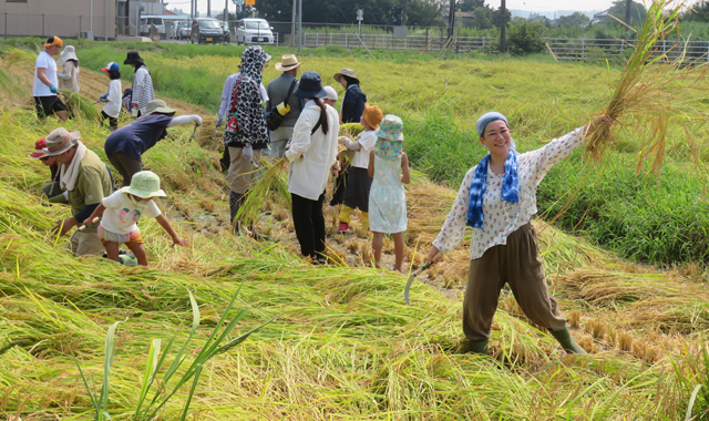 - 田んぼには、強烈な日差しが照りつける猛烈な暑さでしたが、皆さんは汗だくだくになりながらも、稲刈りがとっても楽しそうでした。