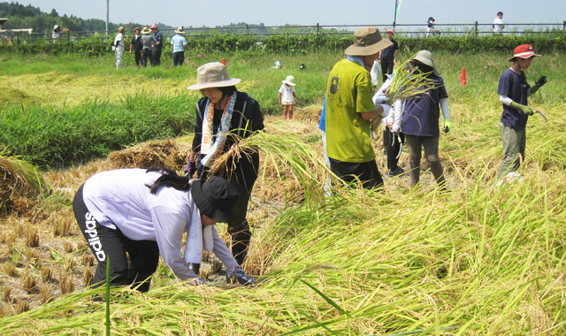 それでもご参加の皆さんは、汗だくだくになりながらも、親子で、またご夫婦で一所懸命刈り取りを楽しんでいました。