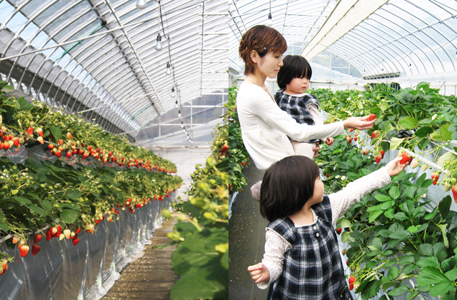 栽培方法も上下2段の『高設2段方式』なので、膝や腰の痛い方には屈 んだりしゃがんだりしなくとも無理なく立ったままで、また小さなお子さんにも手が届きますから一緒にイチゴ狩りが楽しめます。